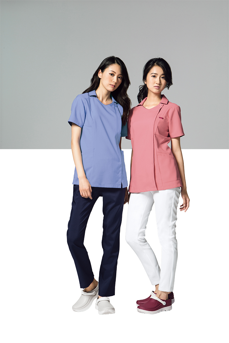現場の声から生まれた「羽織って着る」ジップスクラブ®。スピーディーに脱ぎ着できるだけでなく、着脱時に化粧や髪が乱れるのを防ぎます。