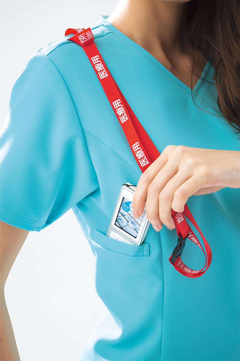 入れたものが落ちにくい、襟ぐりの斜めポケット。PHSを入れるのに便利。