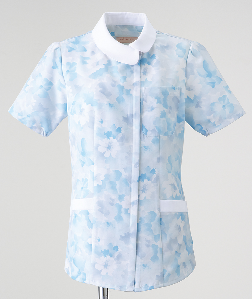 患者さんの不安や緊張を和らげ、やすらぎを与える花柄のウエア。 白い襟が清潔感を強調します。 PHSの出し入れがしやすいサイズと位置を考慮して、右脇下に機能的なポケットを設けています。 ラセルツイルをプリント下地に使用。淡色にありがちな透けを少なくし、オールシーズン着用していただける質感に仕上げました。 胸ポケット内側共地ループ/右腰ポケット/内側ペン差し布付/右胸ポケット/両脇ポケット/袖下ゴム入り